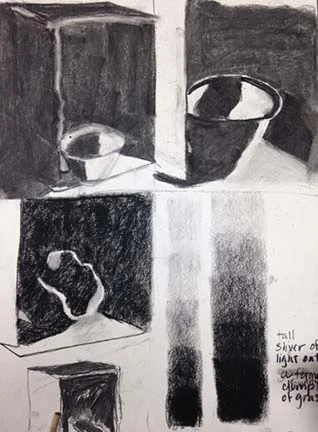 After studying the effects of light on simple shapes (ie. styrafoam balls and pumpkins- remember that newsletter?) we are moving on to something a little more complicated-- bird's nests and open boxes. The drawing below shows the process of learning to first simplify the form (in this case we used a bowl) and record the effects of strong light using 5 values.